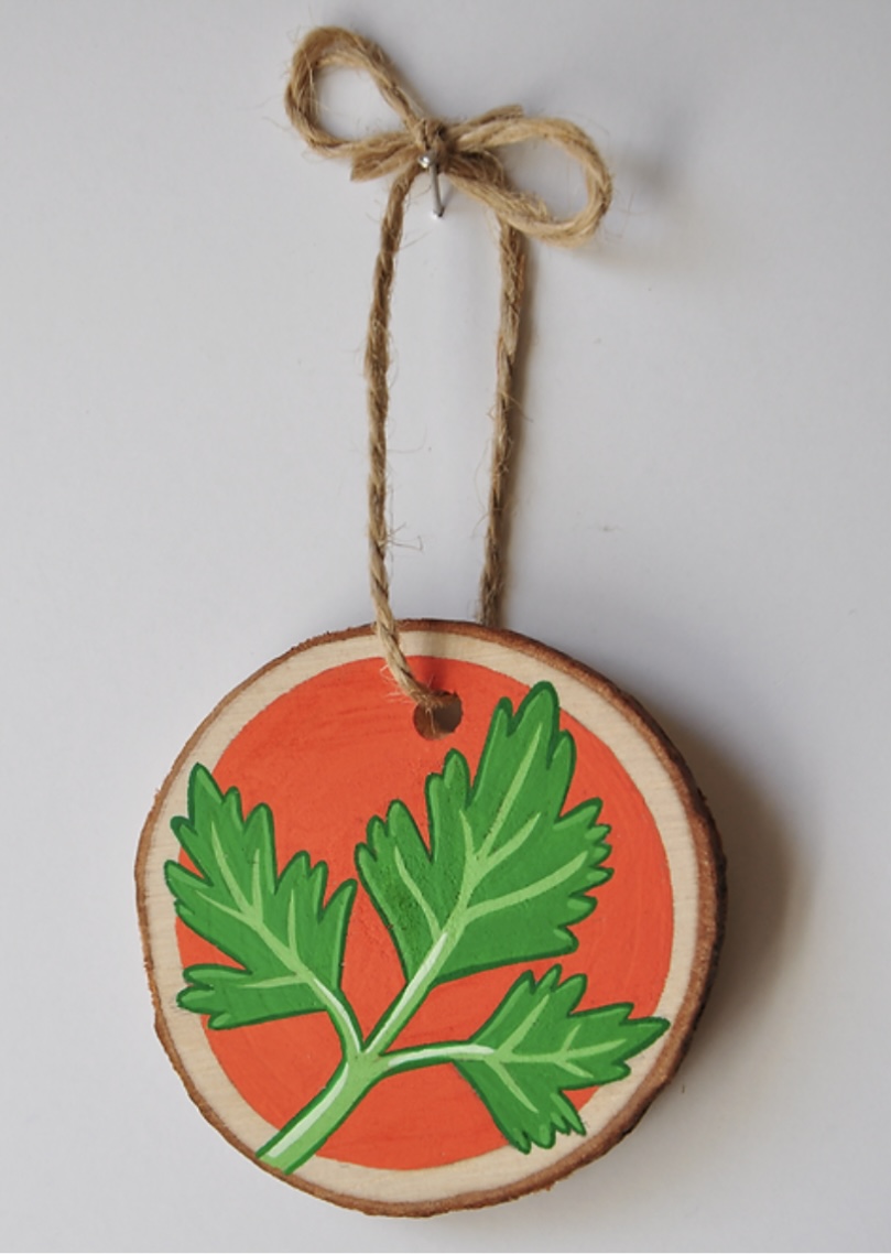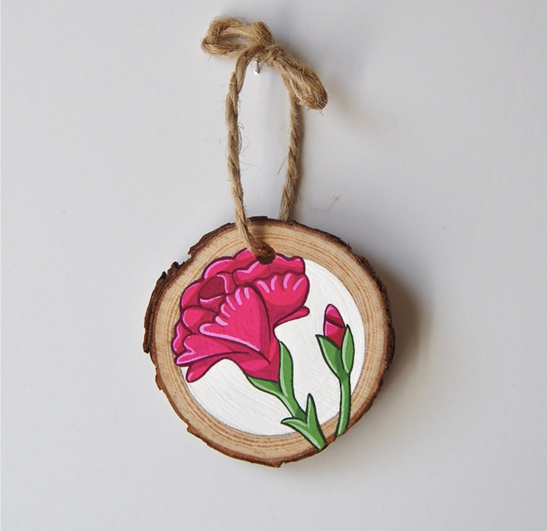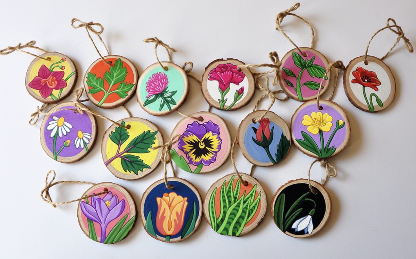 Handpainted original artwork. Gouache on basswood round. Size: approx. 2 x 2 inches each. Each piece is threaded with twine, allowing it to be hung on a wall or used as a tree ornament. Hang the piece in a dry location and dust with a soft dry cloth if needed.