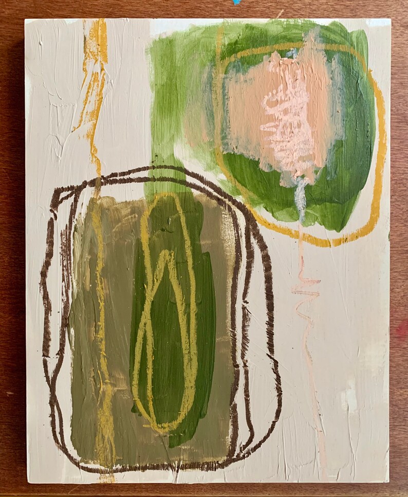 Abstract mixed media work exploring layers, lines and neutral blocks of color.